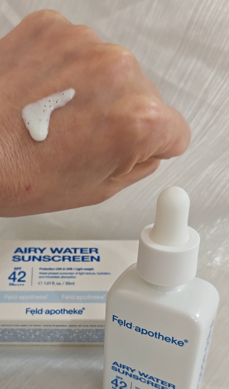 Exp 2027 Feld apotheke 保濕安瓶防曬精華SPF42 PA++++ Airy Water Sunscreen 30ml 這款防曬不油,完全沒有黏稠感覺,質地跟保濕安瓶一樣,濕潤不黏,質地輕盈、清爽、溫和,改變了防曬護理的標準 皮膚不僅會因光而受損,還會因為熱而受傷害。發炎發熱會使皮膚乾燥,並促進衰老的問題。 搽咗保濕安瓶防曬之後可以降低皮膚的溫度,係炎熱的陽光或激光療程後,立刻冷卻灼熱的皮膚,鎮靜下來 溫和產品,小朋友/孕婦,高能量療程後,如Hifu、laser、微針射頻等面部高能量療程,都可以使用