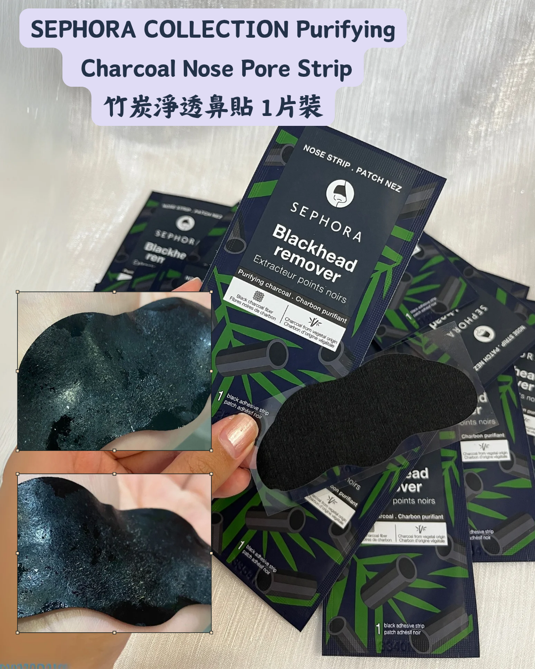SEPHORA COLLECTION Purifying Charcoal Nose Pore Strip 竹炭淨透鼻貼 1片裝 一種由 100% 炭纖維組織製成的黏性鼻貼,一次使用即可減少黑頭和雜質。 膚質:中性、乾性、混合性、油性 👃鼻部清潔毛孔和油膩 建議使用: - 每週使用兩次。 - 見議每晚沖涼後立即使用,卸妝並清潔鼻子。 -不要完全乾燥,讓皮膚保持微濕潤。 -撕掉透明保護膜。 -將鼻貼貼在略微濕潤的鼻子皮膚上,光滑的一面朝向皮膚。 -保持10分鐘後。 -撕下, 後繼塗抹爽膚水,精華,面霜。